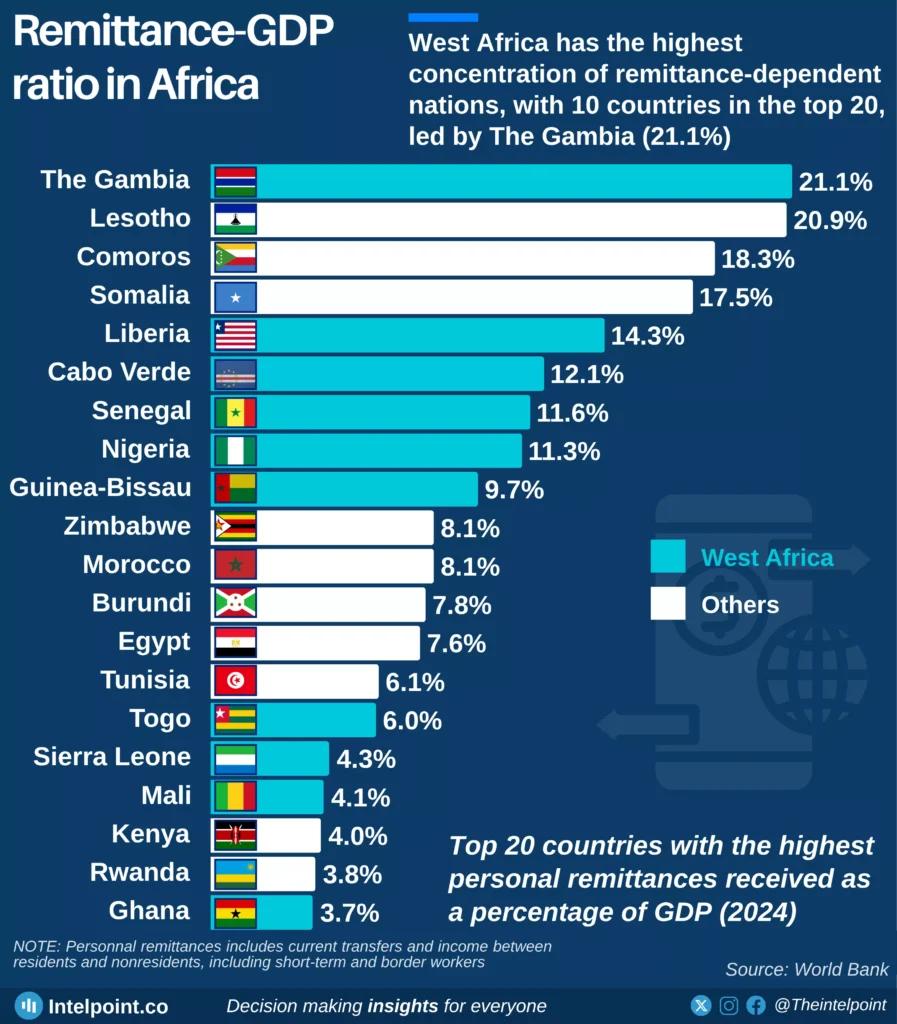 Sub-Saharan Africa received $56 billion in remittances in 2024. The Gambia relies on remittances for over 21% of its GDP, while Lesotho and Comoros also have high remittance-to-GDP ratios.